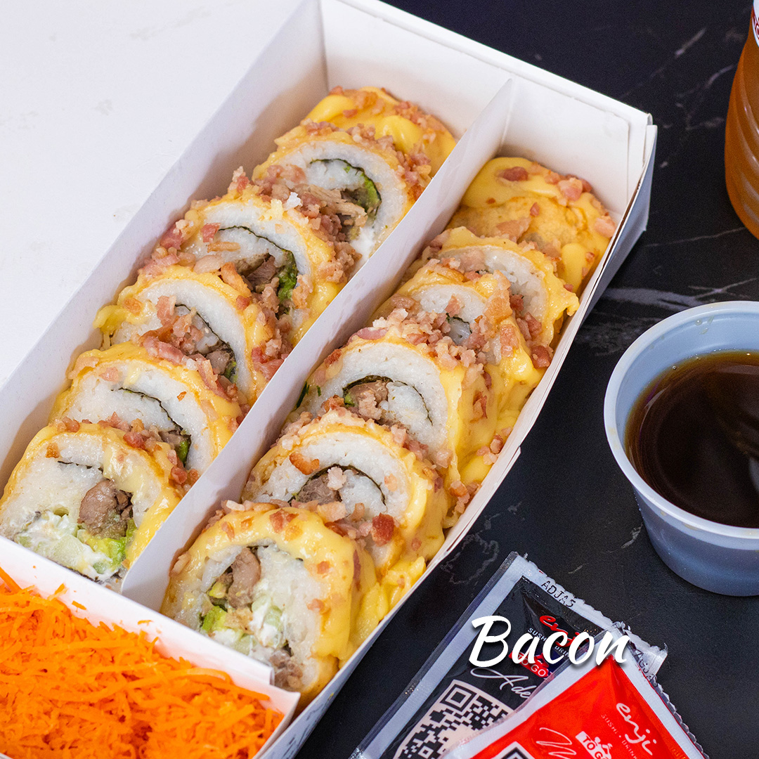Res, pepino, Philadelphia®, aguacate por dentro, cubierto de tocino y gratinado.
