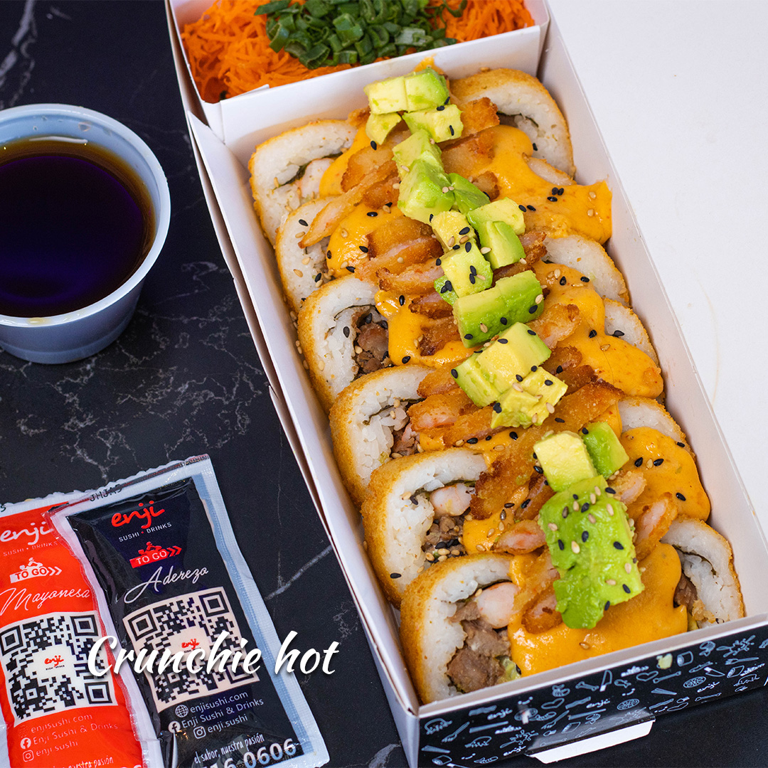 Más culichi que nunca, por dentro camarón, res, Philadelphia®, aguacate y pepino, gratinado con mezcla de quesos, con topping de tampico y punto de sriracha.