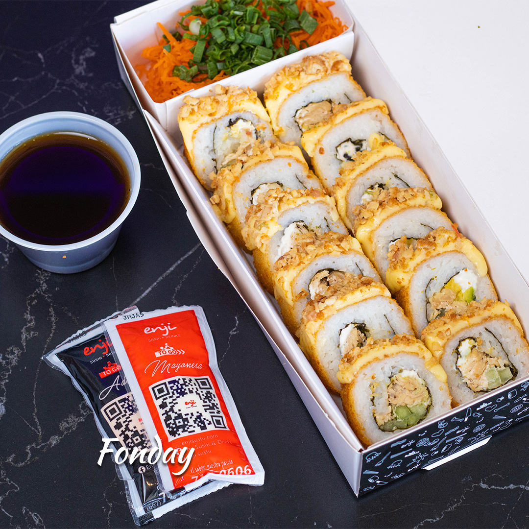 Al más puro estilo culichi, camarón, res, tocino, Philadelphia®, pepino y aguacate por dentro, dos quesos por fuera, coronado con tampico crunch.