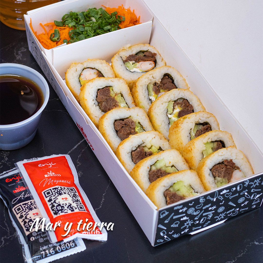 Al más puro estilo culichi, camarón, res, tocino, Philadelphia®, pepino y aguacate por dentro, dos quesos por fuera, coronado con tampico crunch.