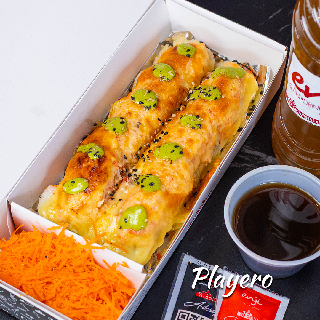 Delicioso rollo empanizado, con Philadelphia®, aguacate y pepino por dentro. Horneado con topping de res, queso manchego, tocino, serrano y sriracha.