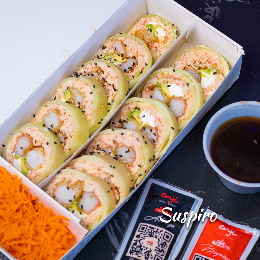Rollo sin arroz, por dentro tampico spicy, camarón tempura, kanikama empanizado, aguacate y Philadelphia®, envuelto en sábana de pepino y ajonjolí.